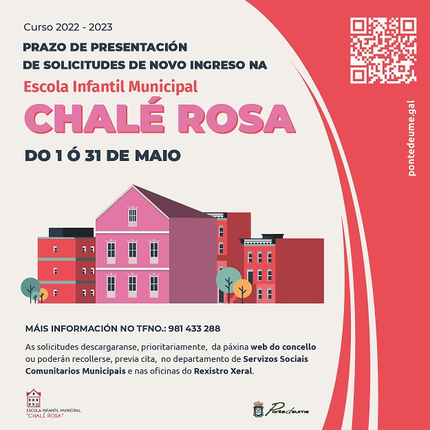 O Concello de Pontedeume abre o prazo para a presentación de solicitudes de novo ingreso na Escola Infantil Municipal Chalé Rosa para o vindeiro curso 2022/2023.