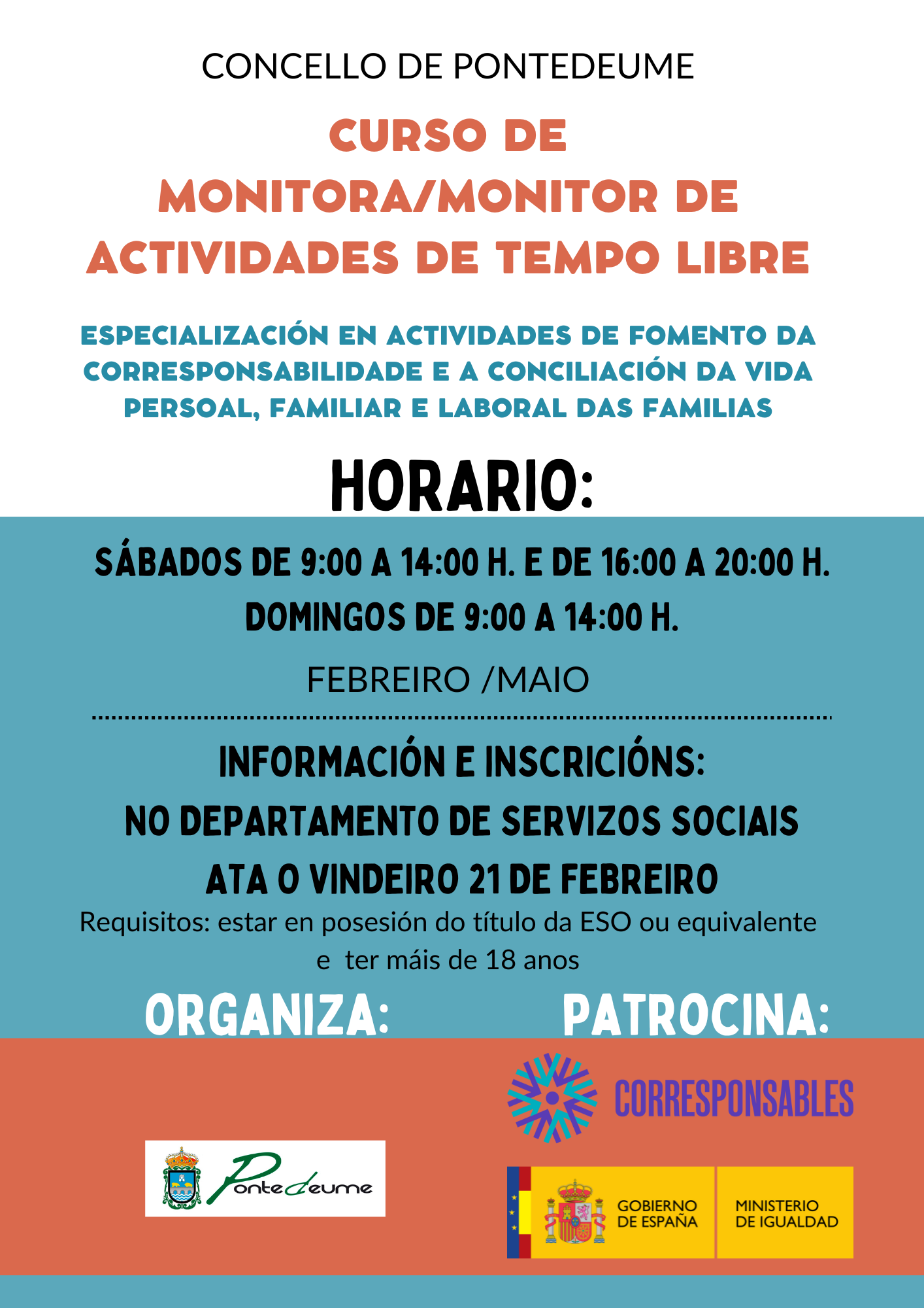 Para impulsar o programa de formación está solicitada unha subvención da Conselleria de Promoción do Emprego e a Igualdade. Conforme marca a Resolución e establecen as bases da Secretaria Xeral de igualdade dentro da Liña Plan Corresponsables a primeira das accións previstas é o Curso de Monitora/Monitor de actividades de Tempo Libre con especial formación en materia de corresponsabilidade e conciliación. Este curso vai deseñado poñendo especial atención no enfoque e a promoción da igualdade entre mulleres e homes, dada a necesidade que existe de contar con persoal profesional para o traballo en servizos e actividades municipais que favorezan a conciliación da vida persoal, familiar e laboral e a corresponsabilidade e novos usos do tempo das familias.