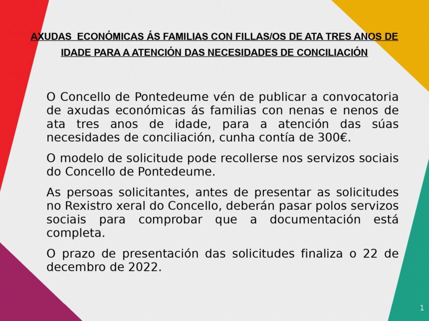 El Ayuntamiento de Pontedeume informa de la convocatoria de las ayudas económicas a las familias con niñas y niños de hasta 3...