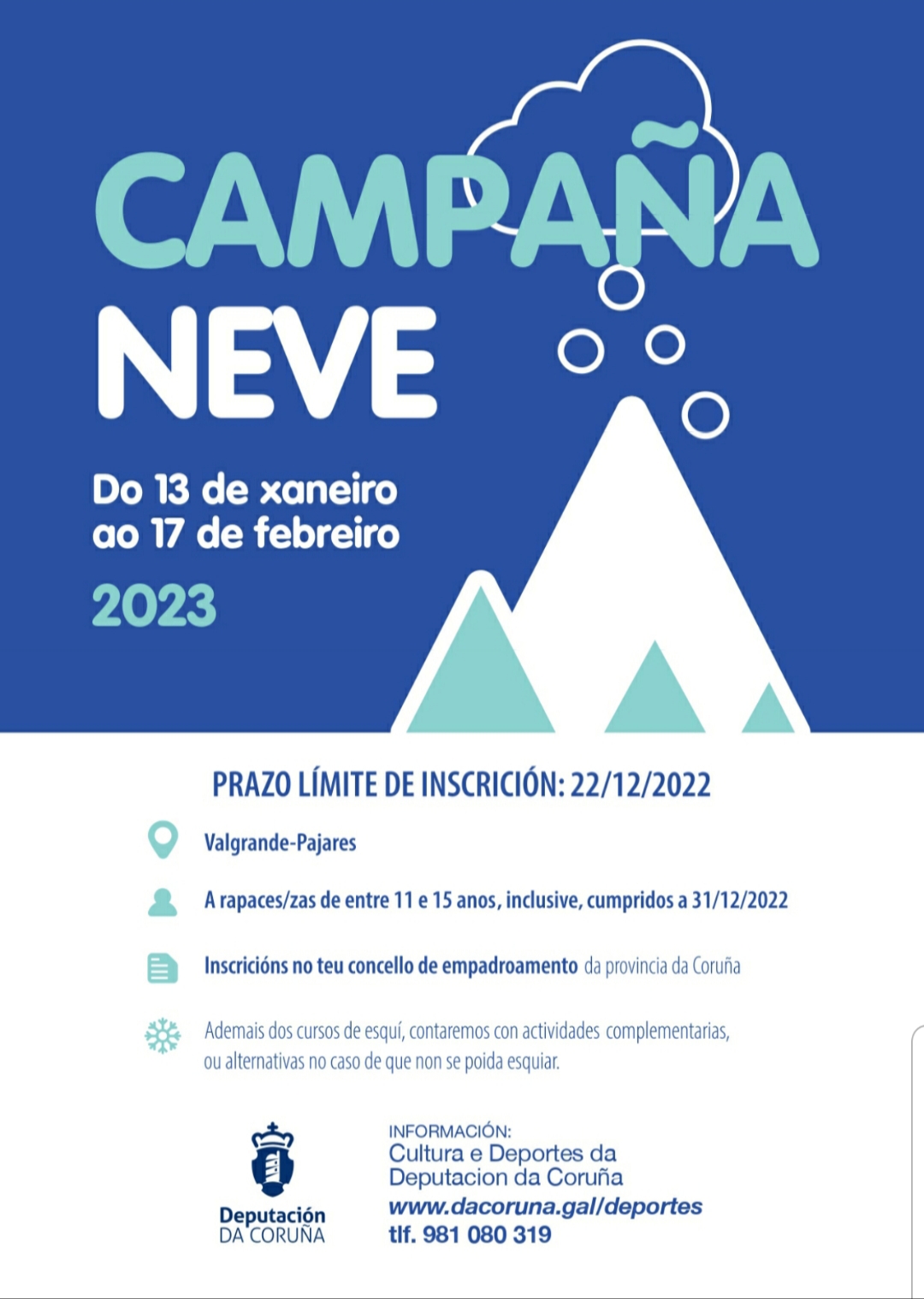 21 diciembre, 202221 diciembre, 2022por Concello de Pontedeumeen Deportes, OcioPlazo límite de inscripción: 22/12/2022 Valgrande-Pajares Para niñas y niños entre 11 y 15 años cumpridos a 31/12/2022