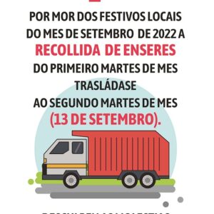Debido a los festivos nacionales del mes de diciembre de 2022 la recogida de enseres del primeir martes de mes se traslada al segundo martes de mes (13 de diembre). Disculpen las molestias.