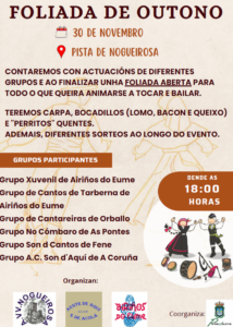 Evento organizado por AAVV Nogueirosa, Xente de aqui e acolá, Airiños do Eume e Concello de Pontedeume. Nesta primeira edición da Foliada de outono convídase a compartir unhas horas de música tradicional onde calquera que toque algún instrumento poderá participar na foliada e desfrutar da música dos seguintes grupos.