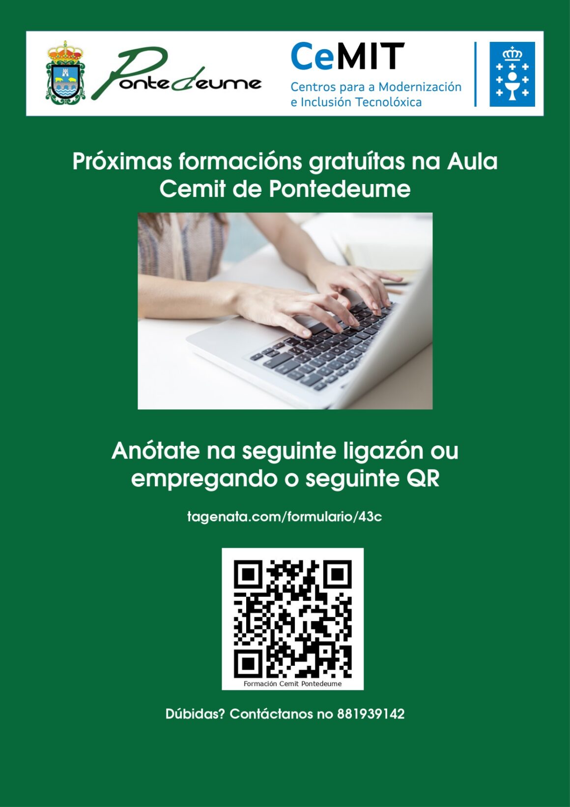 El Ayuntamiento de Pontedeume acoge, en el aula CeMIT, nuevos cursos de formación que comenzarán en este mes de septiembre. Las inscripciones son gratuitas y pueden realizarse en la dirección tagenata.com/formulario/43c
