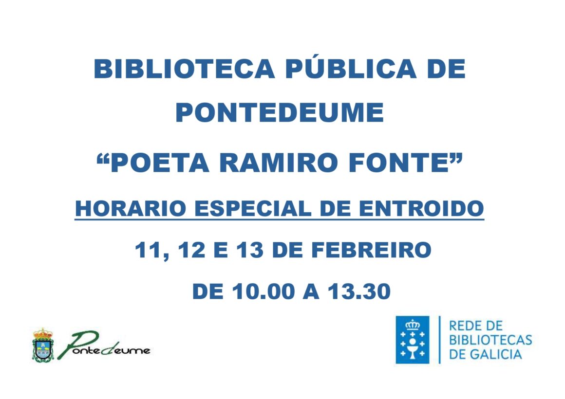 1 febrero, 20241 febrero, 2024por Concello de Pontedeumeen OtrasHorario de la Biblioteca Pública Municipal «Poeta Ramiro Fonte» los días 11, 12 y 13 de febrero. De 10.00 a 13.30h.