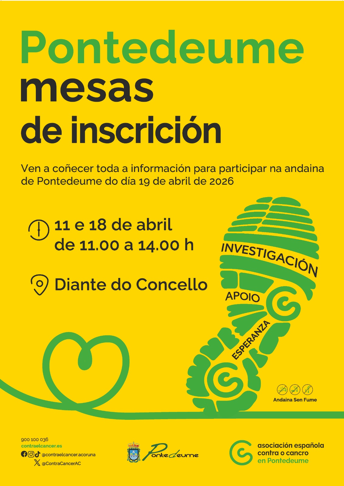 Mesas de inscrición diante do Concello de Pontedeume para a andaina do vindeiro domingo 19 de abril, organizada pola Xunta Local de Pontedeume da Asociación Española Contra o Cancro.