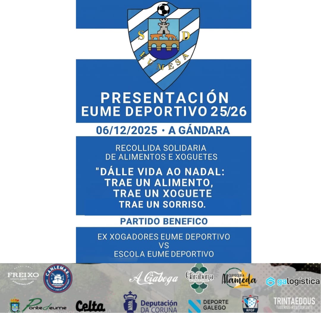 Campo de Fútbol A Gándara Esteiro s/n, Pontedeume, A Coruña, Spain🎤⚽ PRESENTACIÓN EUME DEPORTIVO 25/26 📍 A Gándara – 06/12/2025 ⏱ Hora presentación: 17:00h. ⚽ Partido benéfico: 18:00h. 🤝 Recollida solidaria para o banco de alimentos do Concello de Pontedeume e xoguetes para Cáritas. 🤝🏻⚽️ Encontro solidario: Ex xogadores Eume Deportivo Vs. Escola Eume Deportivo