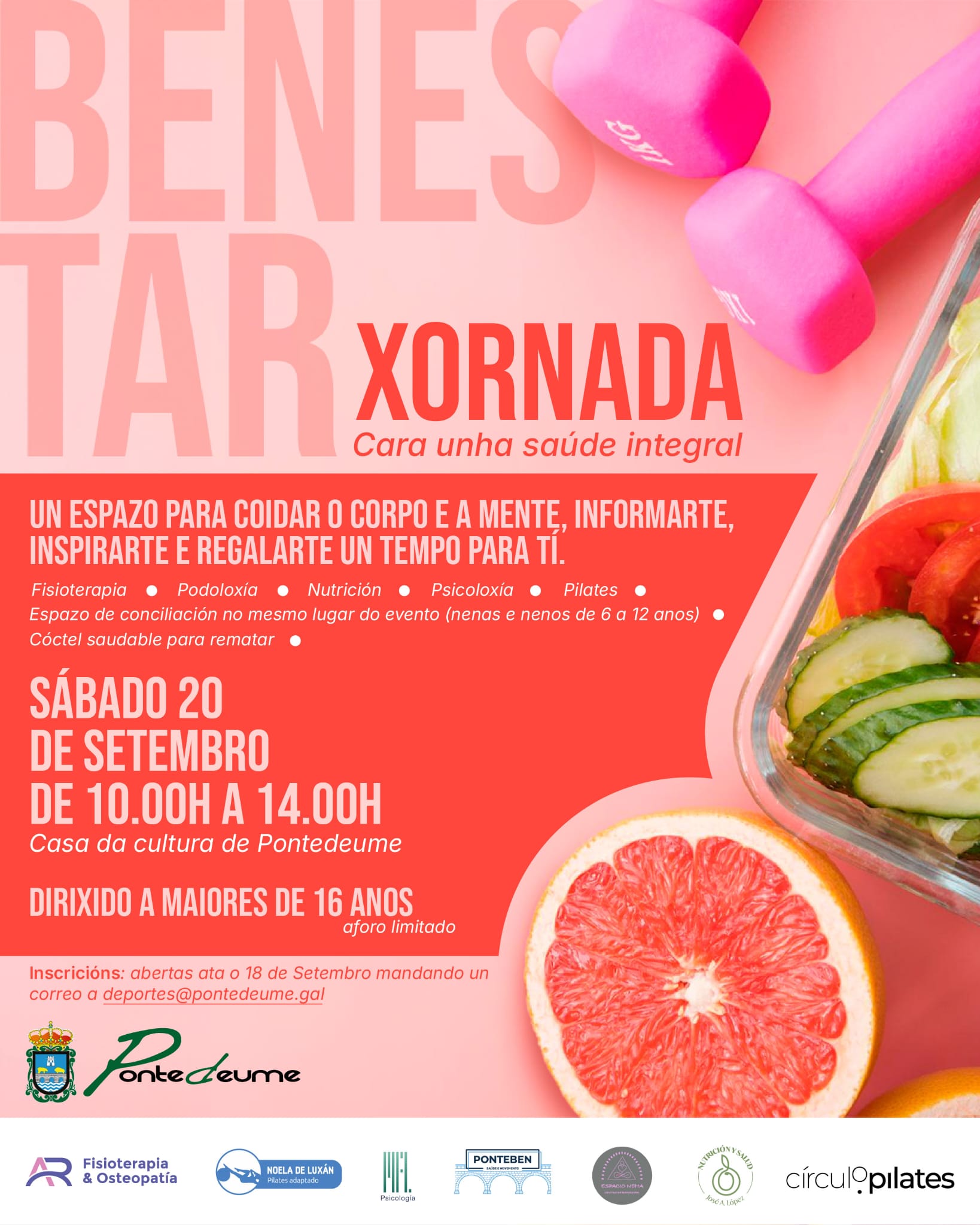 XORNADA DE BENESTAR – CARA UNHA SAÚDE INTEGRAL O sábado 20 de setembro, de 10:00h a 14:00h, na Casa da Cultura de Pontedeume. Haberá charlas e obradoiros de: - FISIOTERAPIA - PODOLOXÍA - NUTRICIÓN - PSICOLOXÍA - PILATES e moito máis. Contaremos cun espazo de conciliación para nenas e nenos de 6 a 12 anos... |