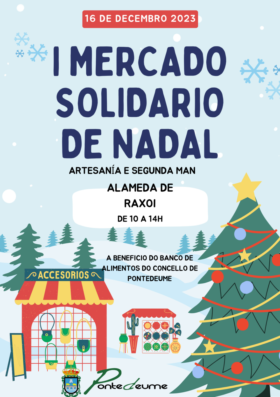O I Mercado Solidario de Nadal ten por obxeto compartir entre a veciñanza a venda ou troco de aqueles artigos que cada quen desexe vender ou canxear e ao mesmo tempo colaborar co Banco de alimentos de Pontedeume nunhas datas tan importantes como é o Nadal.