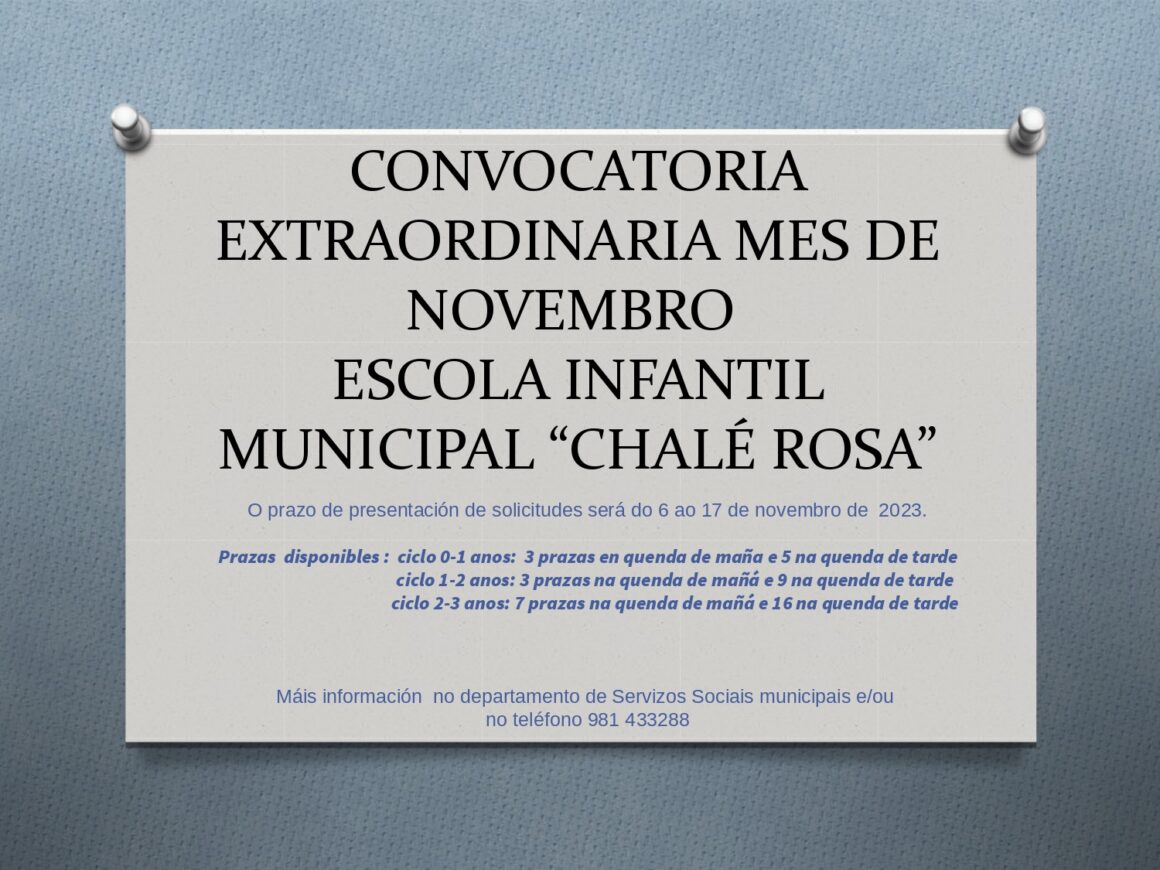 LISTAXE DEFINITIVA DE ADMITIDAS/OS, EXCLUIDAS/OS E LISTA DE ESPERA DA CONVOCATORIA EXTRAORDINARIA DO MES DE NOVEMBRO DE 2023 DA ESCOLA INFANTIL MUNICIPAL “CHALÉ ROSA” (CURSO 2023-2024)