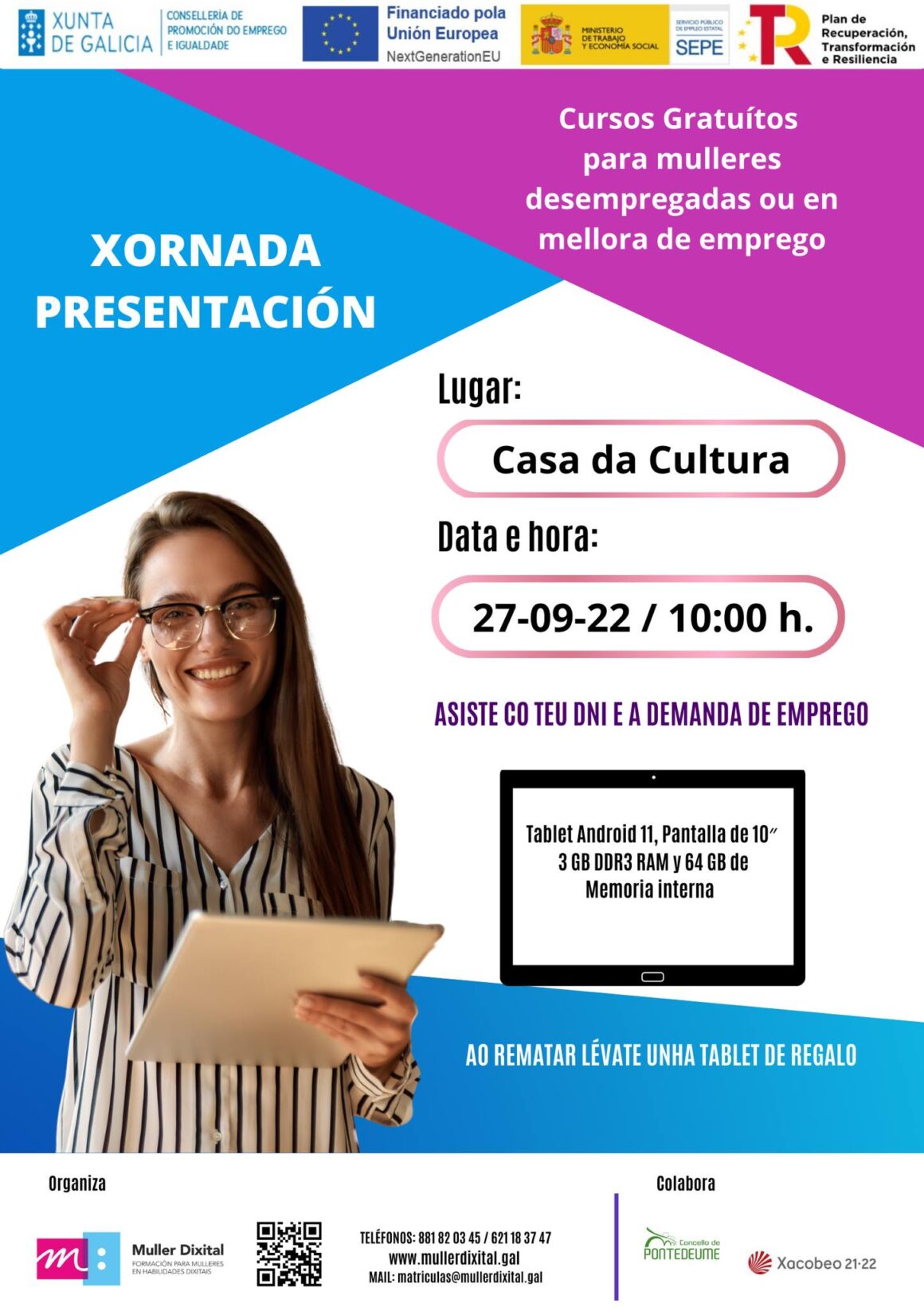 Todas as mulleres interesadas en participar nesta formación teñen que estar dadas de alta como demandantes de emprego e ou mellora de emprego, e poden informarse e realizar unha proba tipo test para saber que curso se adapta as súas necesidades nunha xornada de presentación o vindeiro martes, 27 de setembro, ás 10:00 horas na Casa da Cultura do Concello de Pontedeume.