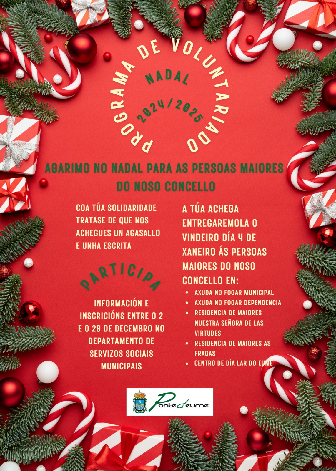 O Concello de Pontedeume vos convida a participar no programa de voluntariado “AGARIMO NO NADAL PARA AS PERSOAS MAIORES DO NOSO CONCELLO”, que ten como obxectivo achegar unhas gotas de ilusión nestas datas tan entrañables coas persoas maiores usuarias dos servizos de axuda no fogar, dependencia, residencias de maiores e centro de día do Concello de Pontedeume.
